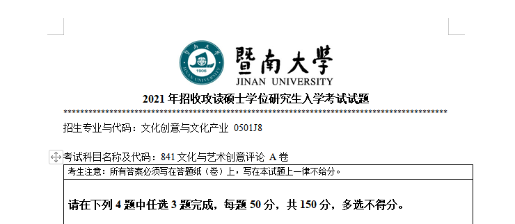 以上是聚创考研网为考生整理的"2021年暨南大学841文化与艺术创意评论考研真题(完整版)"的相关考研信息,希望对大家考研备考有所帮助! 备考过程中如有疑问,也可以添加老师微信juchuang911进行咨询。