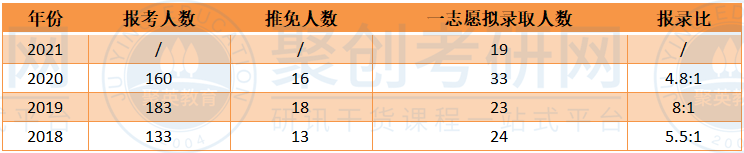 从21考研的拟录取人数来看,录取人数降低了很多,至于22考研的录取人数会不会增加,暂时还不太确定,同学们可以在等到22考研招生专业目录出来后,查看招生计划,看看是否有大的变化。因为21考研报考人数学校暂时还未公布,所以从前三年的报录比我们可以看到,19考研的报录比达到了8:1,比18考研和20考研高出了很多,主要原因可能是因为前一年报录比较低,导致这一年报考人数增多,从而报录比也提高了;20考研的报考人数较前一年减少了,同时拟录取人数较前一年增加了10人,导致这一年报录比降低了不少。
