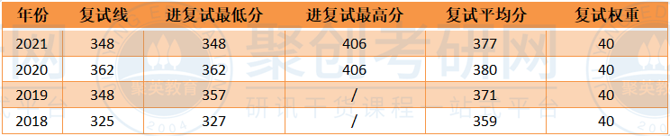总成绩=初试成绩×60%+复试成绩×40%×5(四舍五入,保留两位小数)。从近四年的复试线来看,20考研的复试线较高,且复试平均分也比较高,可以看得出来,这一年的生源质量是比较好的,竞争力自然也是比较高;21考研的复试线为348,这个分数相对来说,还算是中等的,不过平均分达到了377,可见生源质量也不低,