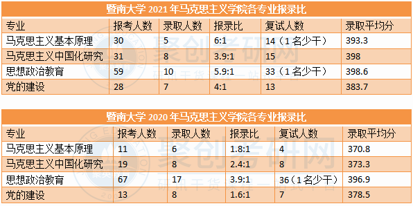 总结:暨南大学马克思主义学院报名人数增加,报录比变高,其中思政专业的招生人数最多,但相对而言报考热度也最大,马原、马中化、党建专业的报考热度更低一些;