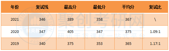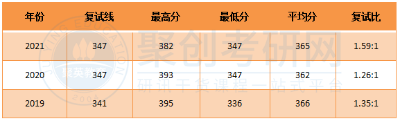 2019年录取最高分409,最低分348;2020年录取最高分404,最低分347;2021年录取最高分411,最低分347。