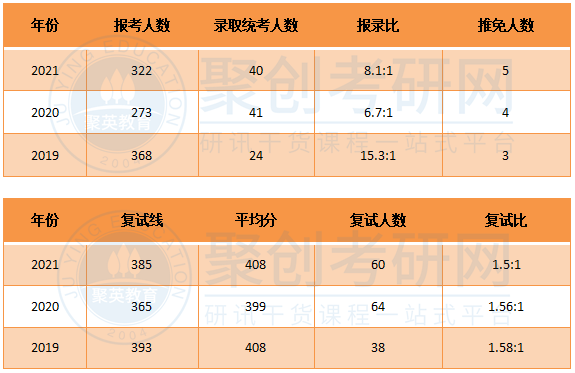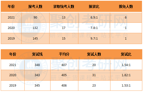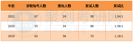 该专业的复试线就是国家A类线,进入复试会比较简单。19年和21年的复试比都是在1.5:1左右,20年比较高,达到1.8:1,复试刷人率还是比较高的。