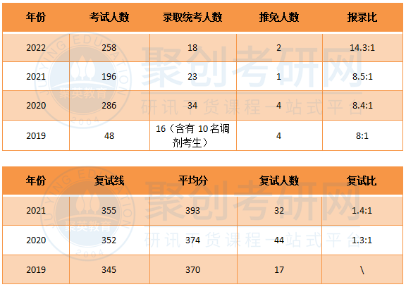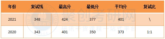 19年和20年的复试线同国家线一样,21年复试线高出国家线25分,该专业热度逐年上涨,以后的复试线应该也是会高于国家线的,进入复试还是有一定难度的。