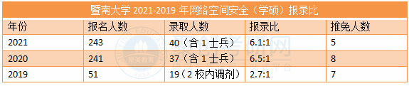 暨大的网安2019年才开始招生,近2年报名人数近245人,报录比约6.5:1,暨大不仅是广东211学校,网安在全国学校中也是相对强势的专业,6.5的报录比不算高,竞争不算大。