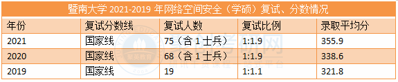 暨大网安近3年复试分数线即是国家线,但最近两年高分考生逐渐增加,2021年录取上岸的考生当中最高分就达到了396分,录取平均分到356分。