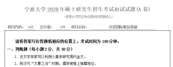 考研学习中,专业课占的分值较大。报考院校专业的考研专业课真题是专业课复习中必不可少的资料。聚创宁波大学考研小编为大家整理了2020年宁波大学445汉语国际教育基础考研真题(完整版),并且可以提供宁波大学考研专业课辅导,希望更多考生能够考上理想的院校。