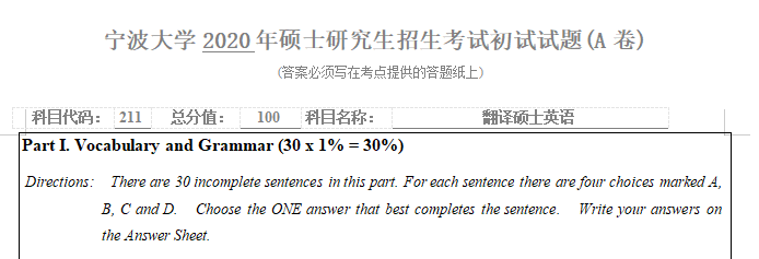 考研学习中,专业课占的分值较大。报考院校专业的考研专业课真题是专业课复习中必不可少的资料。聚创宁波大学考研小编为大家整理了2020年宁波大学211翻译硕士英语考研真题(完整版),并且可以提供宁波大学考研专业课辅导,希望更多考生能够考上理想的院校。