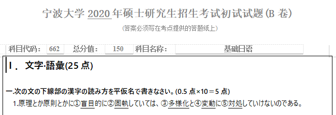 考研学习中,专业课占的分值较大。报考院校专业的考研专业课真题是专业课复习中必不可少的资料。聚创宁波大学考研小编为大家整理了2020年宁波大学662基础日语考研真题(完整版),并且可以提供宁波大学考研专业课辅导,希望更多考生能够考上理想的院校。