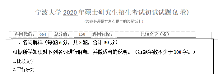 考研学习中,专业课占的分值较大。报考院校专业的考研专业课真题是专业课复习中必不可少的资料。聚创宁波大学考研小编为大家整理了2020年宁波大学664比较文学(汉)考研真题(完整版),并且可以提供宁波大学考研专业课辅导,希望更多考生能够考上理想的院校。