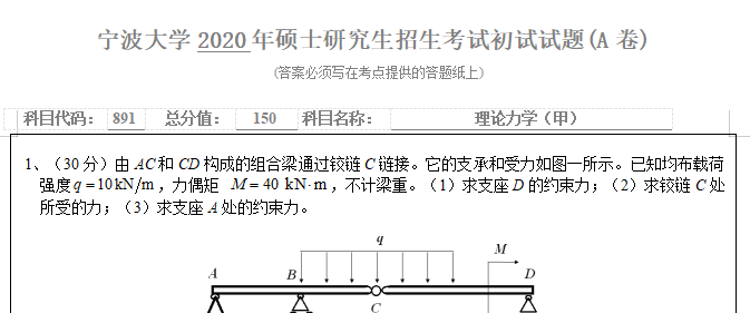 考研学习中,专业课占的分值较大。报考院校专业的考研专业课真题是专业课复习中必不可少的资料。聚创宁波大学考研小编为大家整理了2020年宁波大学891理论力学(甲)考研真题(完整版),并且可以提供宁波大学考研专业课辅导,希望更多考生能够考上理想的院校。