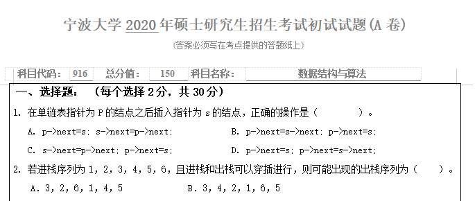 完整版请下载附件:2020年宁波大学916数据结构与算法考研真题(完整版)