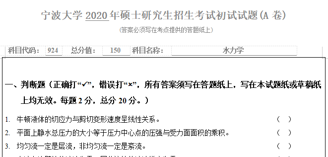 完整版请下载附件:2020年宁波大学924水力学考研真题(完整版)