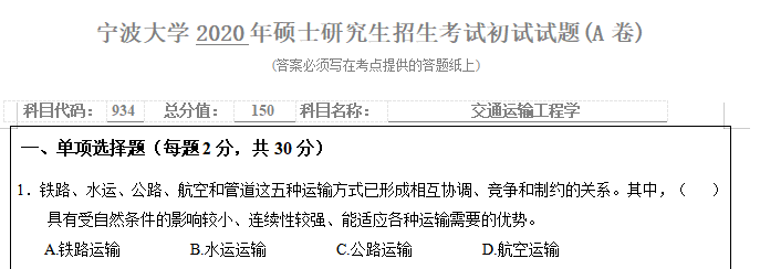 考研学习中,专业课占的分值较大。报考院校专业的考研专业课真题是专业课复习中必不可少的资料。聚创宁波大学考研小编为大家整理了2020年宁波大学934交通运输工程学考研真题(完整版),并且可以提供宁波大学考研专业课辅导,希望更多考生能够考上理想的院校。
