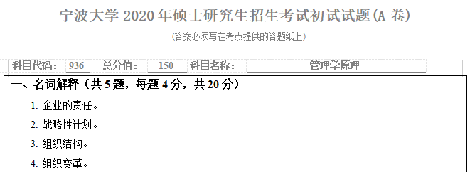 考研学习中,专业课占的分值较大。报考院校专业的考研专业课真题是专业课复习中必不可少的资料。聚创宁波大学考研小编为大家整理了2020年宁波大学936管理学原理考研真题(完整版),并且可以提供宁波大学考研专业课辅导,希望更多考生能够考上理想的院校。