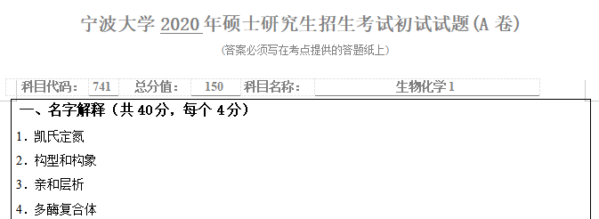 考研学习中,专业课占的分值较大。报考院校专业的考研专业课真题是专业课复习中必不可少的资料。聚创宁波大学考研小编为大家整理了2020年宁波大学741生物化学1考研真题(完整版),并且可以提供宁波大学考研专业课辅导,希望更多考生能够考上理想的院校。