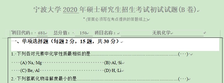 完整版请下载附件:2020年宁波大学681无机化学初试试卷考研真题(完整版)