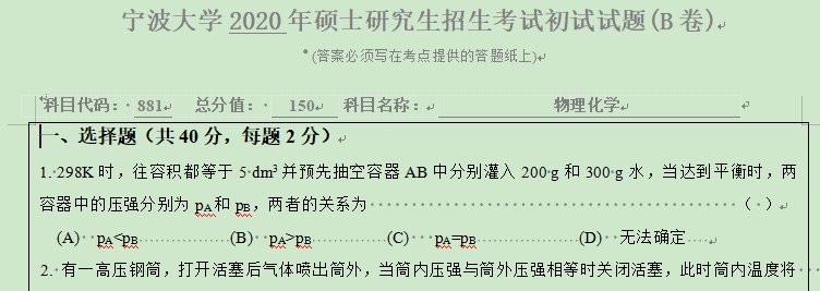 完整版请下载附件:2020年宁波大学881物理化学初试试卷考研真题(完整版)