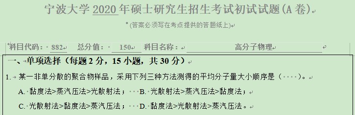 考研学习中,专业课占的分值较大。报考院校专业的考研专业课真题是专业课复习中必不可少的资料。聚创宁波大学考研小编为大家整理了2020年宁波大学882高分子物理初试试卷考研真题(完整版),并且可以提供宁波大学考研专业课辅导,希望更多考生能够考上理想的院校。