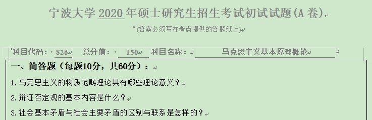 考研学习中,专业课占的分值较大。报考院校专业的考研专业课真题是专业课复习中必不可少的资料。聚创宁波大学考研小编为大家整理了2020年宁波大学826马克思主义基本原理概论初试试卷考研真题(完整版),并且可以提供宁波大学考研专业课辅导,希望更多考生能够考上理想的院校。