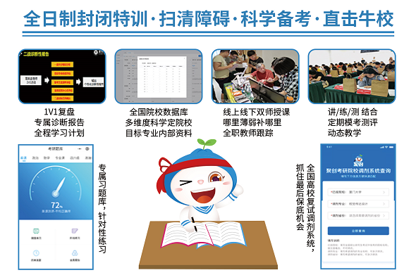 全日制半封闭特训,专属老师督学,自律性差的同学也不用担心。利用聚创数据资料库,为二战学生高效解决院校专业问题,打破考研资源的不对称,多维度科学定院校。
