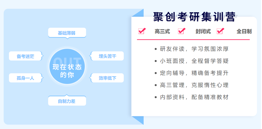 这是聚创考研广州集训营最近推出的考前集训营,最大效率的为大家总结知识点,复习内容,以及考前冲刺,强度高,让同学们体验前所未有的考研高涨紧张氛围,里面包含了酒店住宿、面授教学、阶段测试、自习答疑等等服务内容