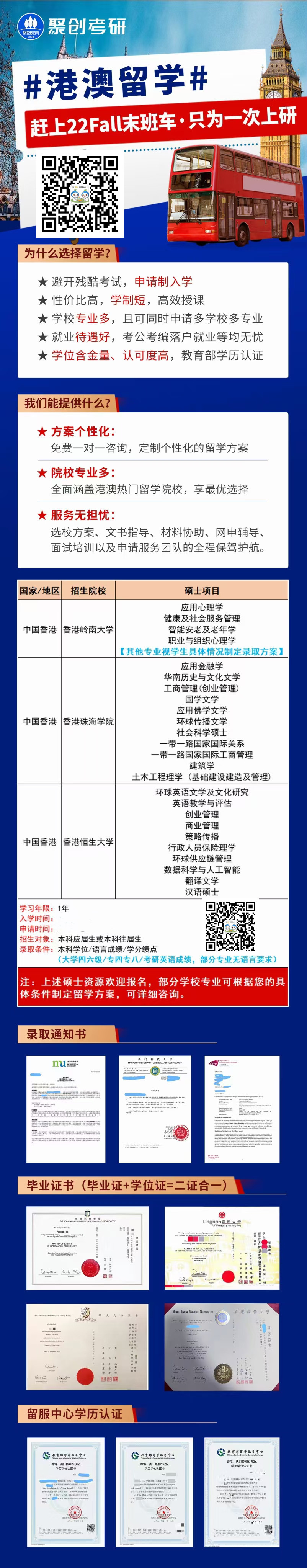 以上是聚创考研网为考生整理的"民办本科可以申请香港研究生吗,民办本科能申请香港研究生吗"的相关考研信息,希望对大家考研备考有所帮助! 备考过程中如有疑问,也可以添加老师微信juchuang911进行咨询。