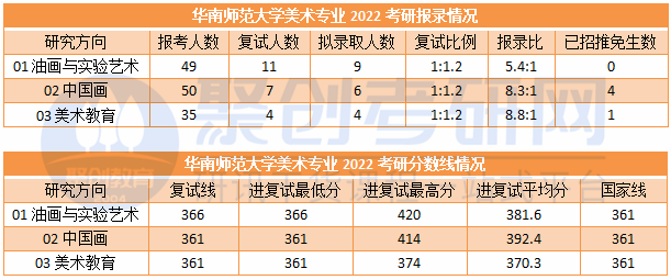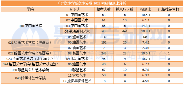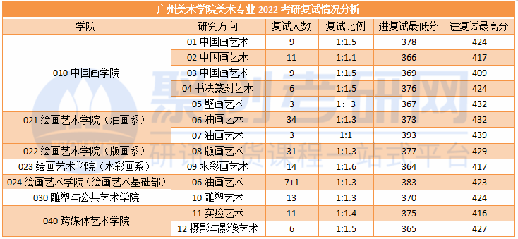 由于研究方向众多,学姐这边简单罗列了一下2022考研的数据,其中进复试分数是换算之前的,换算后的分数会有所不同,具体同学可以点击链接查看:附件:广州美术学院2022年硕士研究生招生考试复试名单.pdf