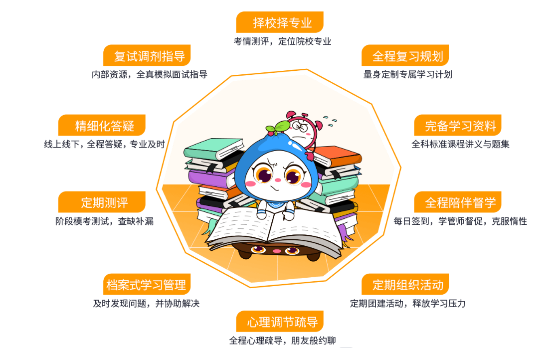 从择校开始,规划全程的复习计划,为大家准备学习资料,全程督学,精准答疑,定期测评,给大家的考研之路保驾护航。