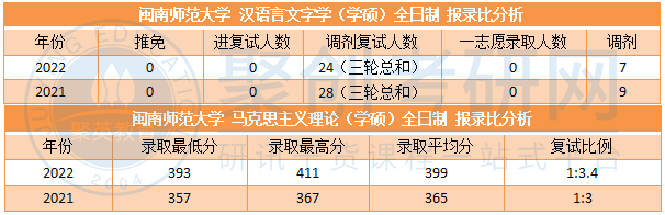 ①闽师大的汉语言文字学学硕生源看起来不太好,因为闽师没有提供每年的报考人数,所以不知道该专业的报考热度,学姐统计了21、22年的数据,这两年的一志愿没有一个进入复试,并且也没有推免。