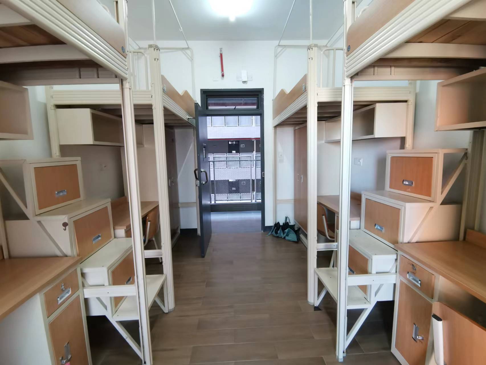 校内宿舍四人间,宿舍内装修一应俱全,每层走道配有饮水机,24小时供应热水。