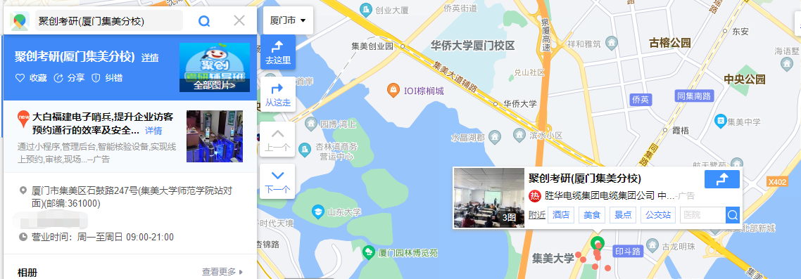 聚创考研集团总部位于福建省厦门市集美区珩山街993号,厦门各大学院校均有直营分校。