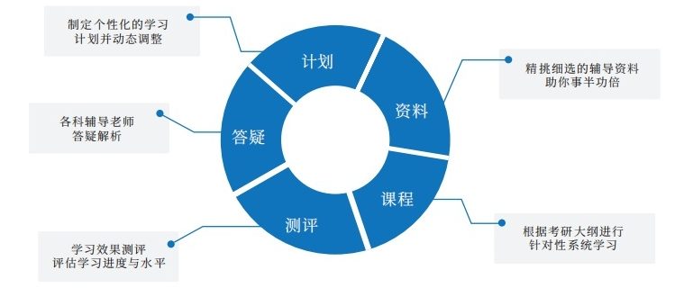 主要包含五大服务模块,30大辅导体系。其中五大服务模块包括计划、测评、资料、课程、测评和答疑五个方面。