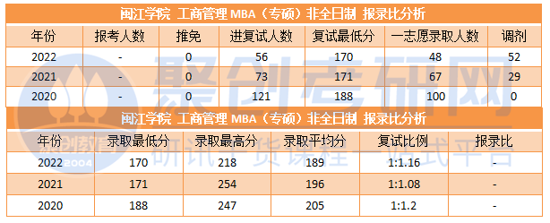 ①从近三年的进入复试人数和复试最低分来看,20年是闽江学院MBA报考热度最高的时候(合理猜测),20年一志愿录取100人,复试比例达到1:1.2,复试最低分188分,竞争比较激烈,且20年不招收调剂生源;