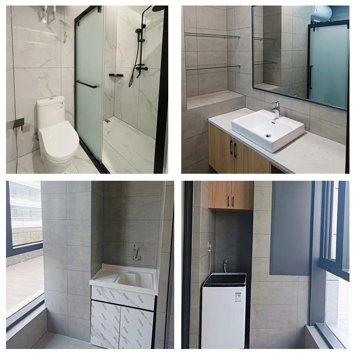 独立卫浴,干湿分离,卫生间配有梳洗镜,墙上有置物架,方便放置物品,各种贴心设计,让你有家的体验与安心~阳台宽敞明亮,配有洗衣机、洗衣池、晒衣杆、储物柜,充分节省室内生活空间,楼道上有多功能饮水机,智能灭菌,不管几点想喝水都不愁~