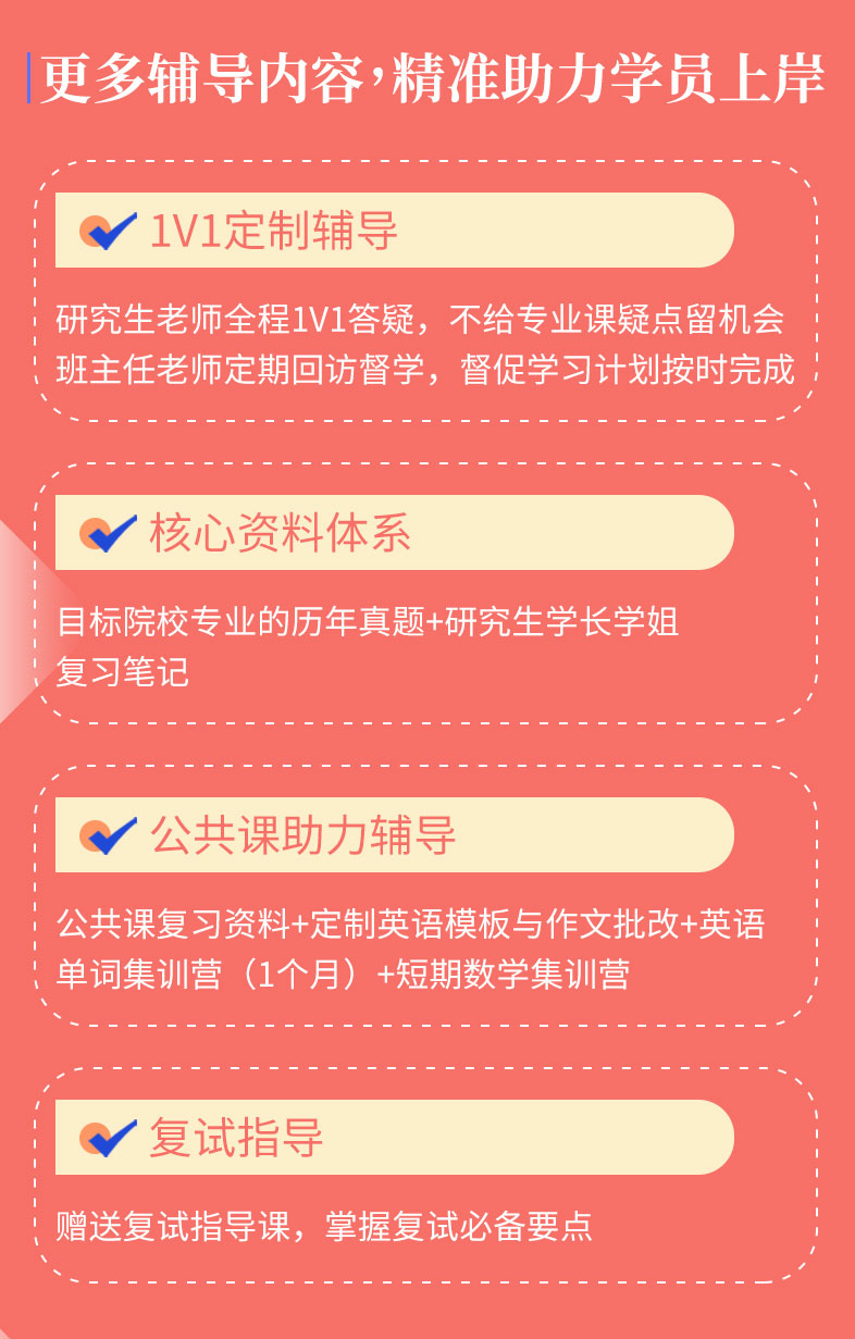 老师全程1V1答疑,不给专业课疑点留机会班主任老师定期回访督学,督促学习计划按时完成