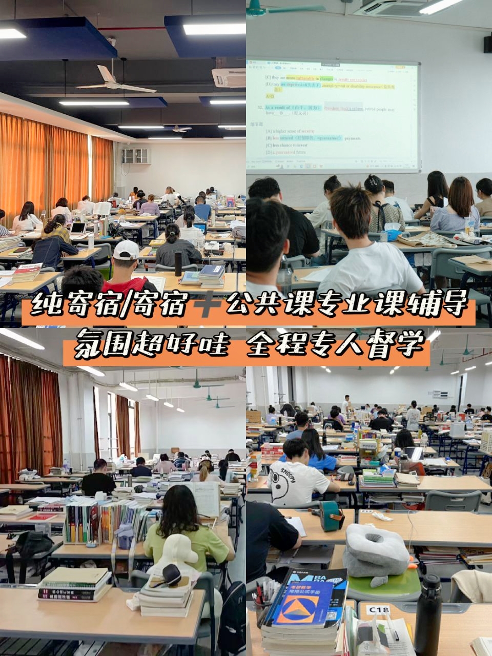 自习室:我们有专属自习室和背诵室,单人单桌,有空调、风扇、wifi等,在炎热的夏天也可以在凉爽的环境下安心复习。