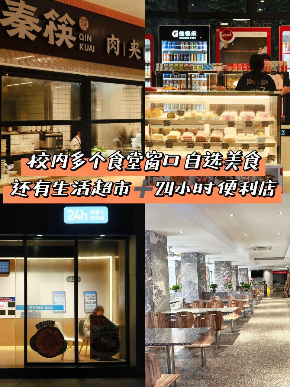 就餐环境:校内有多个食堂窗口,各种美食自己选择,除了食堂之外,校内还有生活超市和24小时便利店。