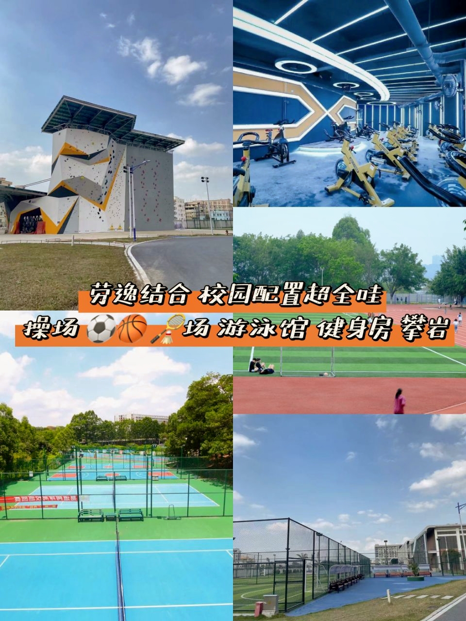 运动设施:校内运动场地齐全,篮球场、足球场、羽毛球场一应俱全,除此之外还有游泳馆、健身房等等。