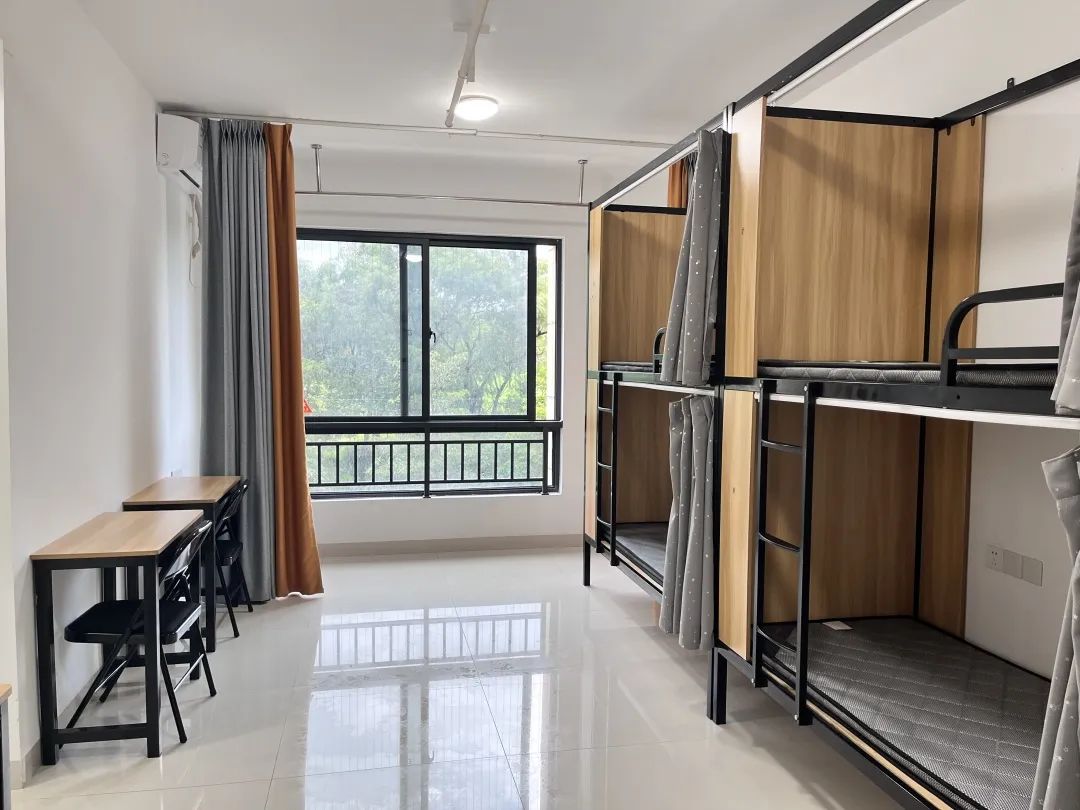 寄宿基地提供公寓式住宿,有单人间、双人间、四人间和六人间多种类型选择!宿舍拥有大面积窗户,窗外视野极佳,采光通风都非常nice!另外每个床位都有帘子,提供更多的私人空间!