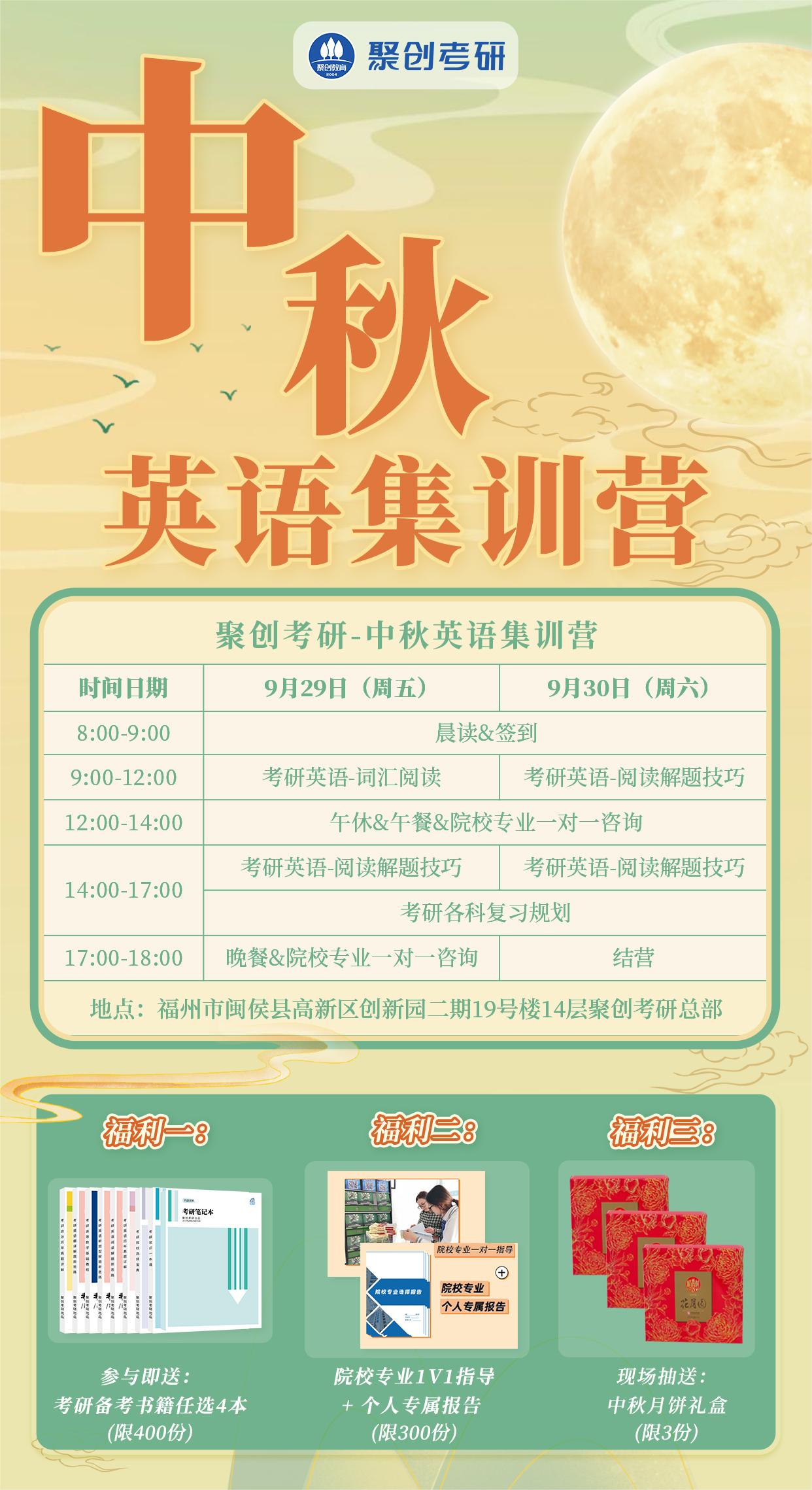 考研不到100天啦!同学们该冲刺起来啦!中秋节即将来临,福州聚创考研开展了线下集训营,大家可以来参加体验看看哦~