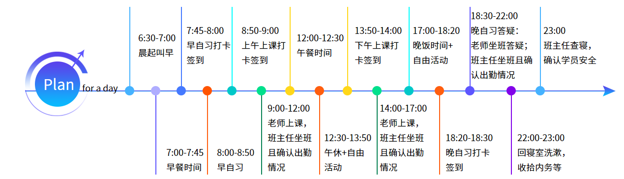 课程每天都排的满满的每天早上七点要开始背诵,会有班主任进班点名。上午9点开始课程授课,会有专业的老师来教授知识,不懂得直接问老师保证问题不要留到第二天甚至知道后期。中午12点下课,有一小时的休息时间,可以吃吃饭,放松一下。下午2点开始上课到晚上5点下课。晚自习还有每日的练习,班主任监督写作业,会有老师批改,还会根据错题进行讲解,争取让我们都能理解知识点。晚上八点以后就是自己的自习时间,可以根据自己的学习计划进行背诵或刷题。每天都过得很充实。