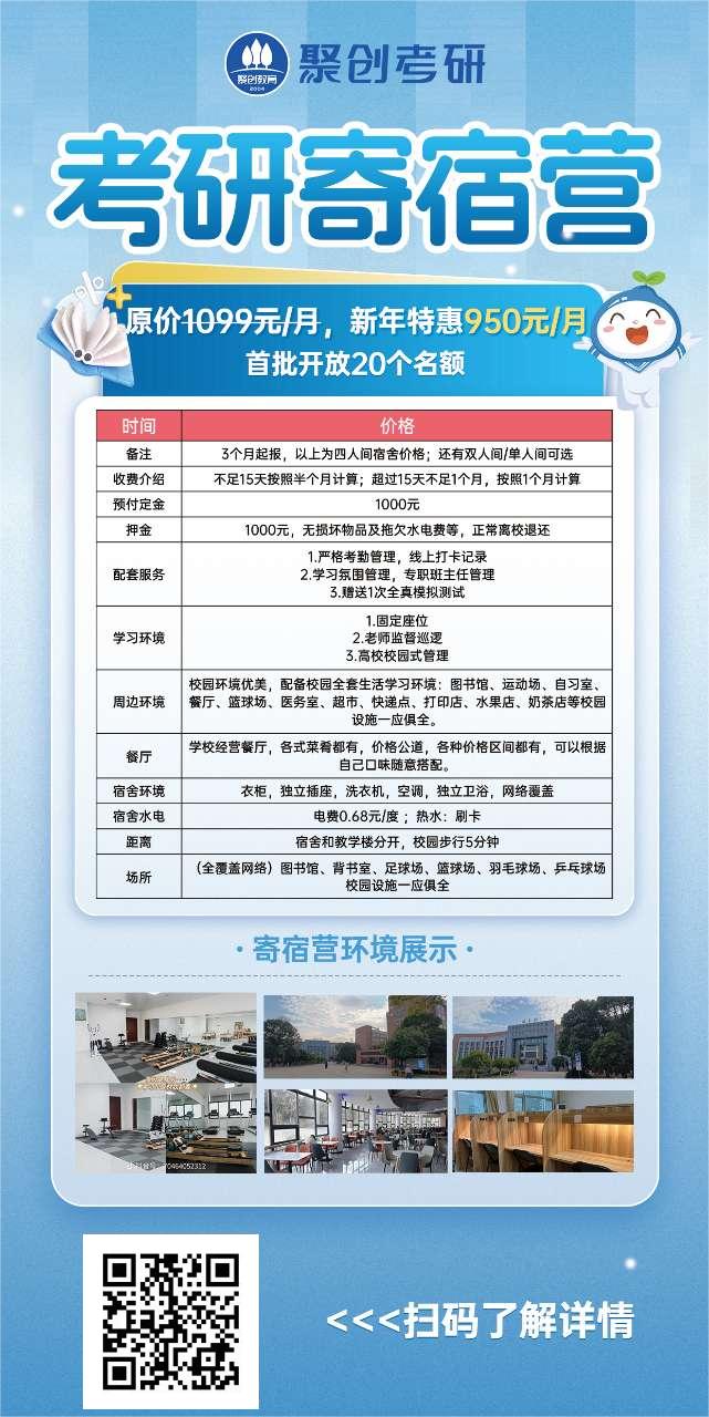 总的来说,长沙聚创考研寄宿营的宿舍条件优越,设施完备,管理严格,能够满足考研学生的学习和生活需求。