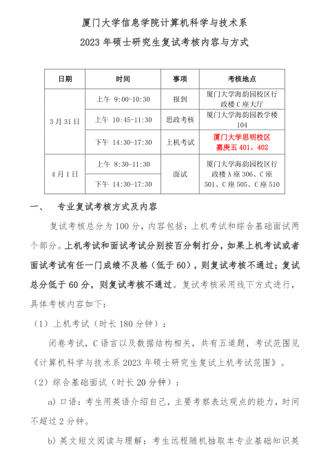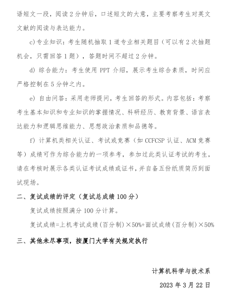 厦门大学信息学院计算机科学与技术复试内容:(仅供参与,以当年公布的公告为准)