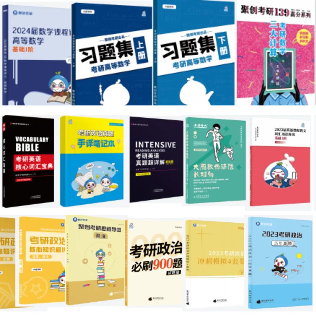 选择好的辅导资料等于成功了一半。我们全程为大家分阶段提供市面优质的辅导书籍和聚创考研内部高端教辅资料。比如英语词汇、英语真题讲义、数学习题集、典型重点题集、真题集、考试分析手册等等。