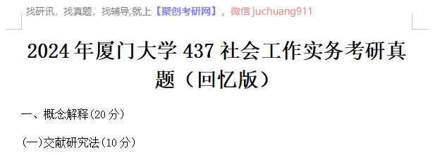 以上是聚创厦大考研网为考生整理的"2024年厦门大学437社会工作实务考研真题(回忆版)"的相关考研信息,希望对大家考研备考有所帮助! 备考过程中如有疑问,也可以添加老师微信juchuang911进行咨询。