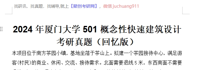 以上是聚创厦大考研网为考生整理的"2024年厦门大学501概念性快速建筑设计考研真题(回忆版)"的相关考研信息,希望对大家考研备考有所帮助! 备考过程中如有疑问,也可以添加老师微信juchuang911进行咨询。