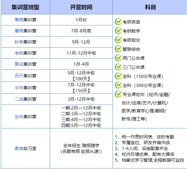 以下是福州聚创考研二战集训营各种班型开营时间: