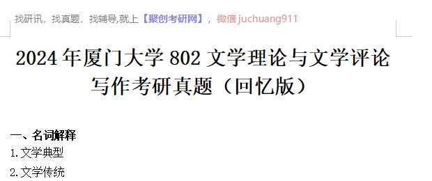 以上是聚创厦大考研网为考生整理的"2024年厦门大学802文学理论与文学评论写作考研真题(回忆版)"的相关考研信息,希望对大家考研备考有所帮助! 备考过程中如有疑问,也可以添加老师微信juchuang911进行咨询。