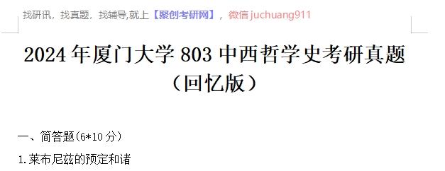 以上是聚创厦大考研网为考生整理的"2024年厦门大学803中西哲学史考研真题(回忆版)"的相关考研信息,希望对大家考研备考有所帮助! 备考过程中如有疑问,也可以添加老师微信juchuang911进行咨询。