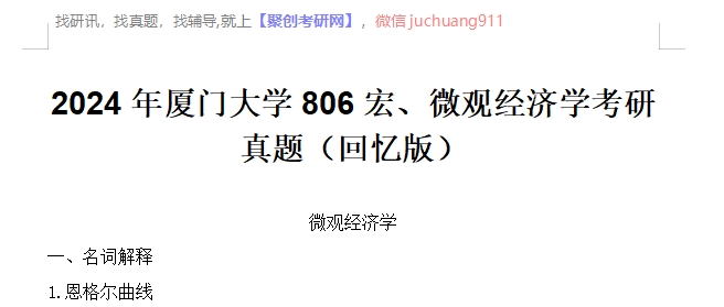 考研学习中,专业课占的分值较大。报考院校专业的考研专业课真题是专业课复习中必不可少的资料。聚创考研网小编为大家整理了2024年厦门大学806宏、微观经济学考研真题(回忆版),并且可以提供厦门大学考研专业课辅导,希望更多考生能够在专业课上赢得高分,升入理想的院校。